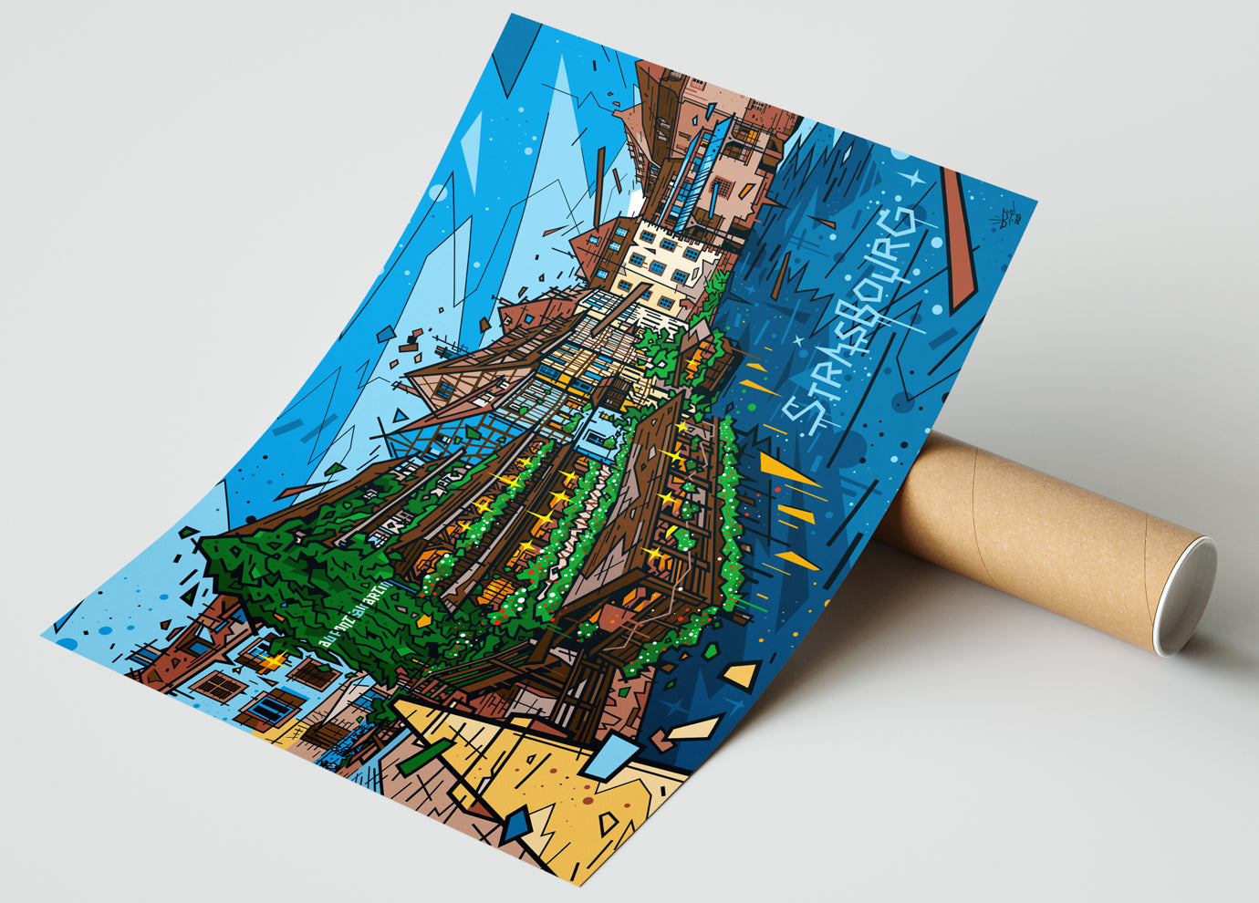 Ni figée ni réaliste, le style de l'illustration oscille pour mieux révéler sa poésie. Échos d’histoire, couleurs contrastées et rythmes graphiques se mêlent pour réinventer cette icône touristique alsacienne avec énergie et malice tout en brouillant la frontière entre passé et présent.