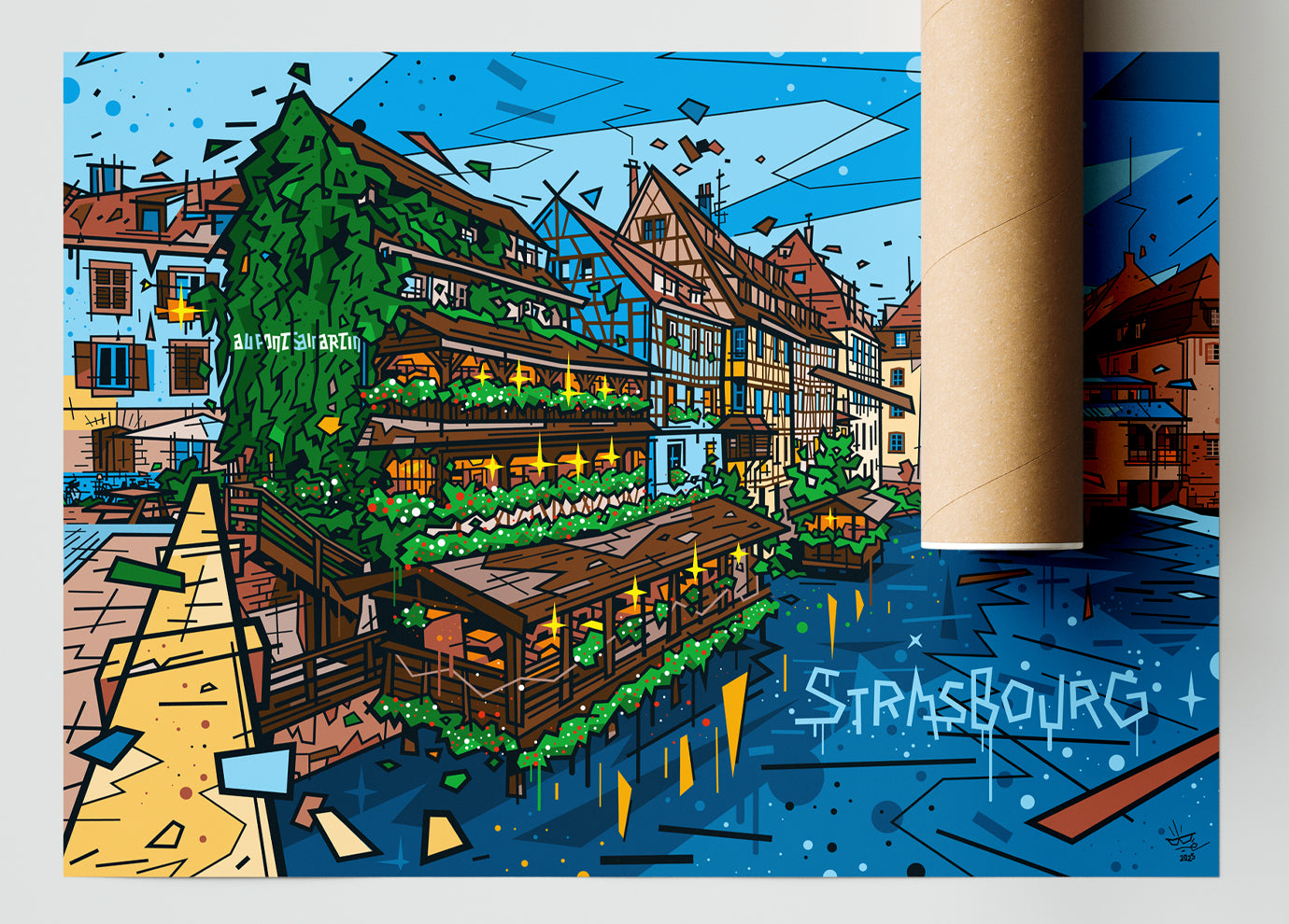 Ici, le célèbre Pont Saint-Martin de Strasbourg, avec son ancienne tannerie du XVIe siècle perchée sur l’Ill, se transforme en un terrain de jeu graphique vivant. Entre structures rigoureuses et envolées visuelles, cette composition capture l’âme du lieu à travers un entrelacs de formes géométriques, de lignes qui se croisent, flottent ou s'échappent, comme une mémoire en mouvement.