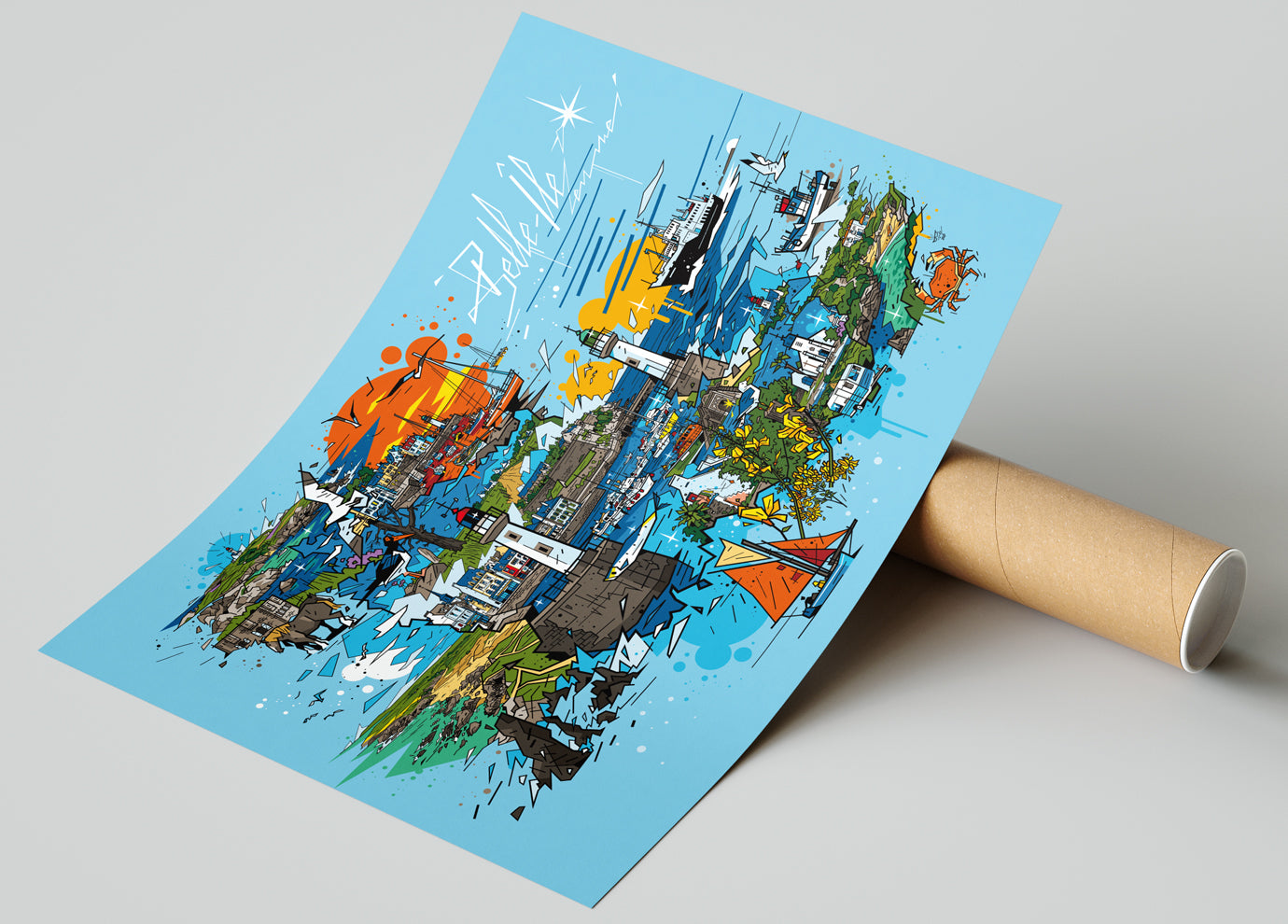 Évocation graphique de Belle-Île-en-Mer, initialement pensée pour la réalisation d'une fresque murale (Plus d'infos dans "Carnet de Bord), cette composition met en scène ses lieux emblématiques - ports, phares, falaises, landes et plages - réunis dans une cartographie imaginaire qui reprend la forme de l’île. L’illustration s’organise comme une mosaïque de fragments, où chaque élément se répond et participe à un ensemble fluide, entre carte et paysage.