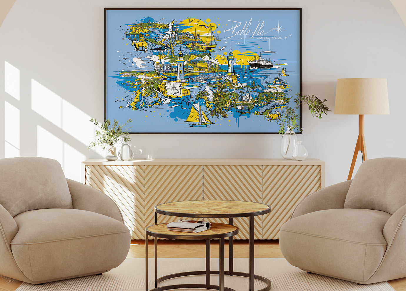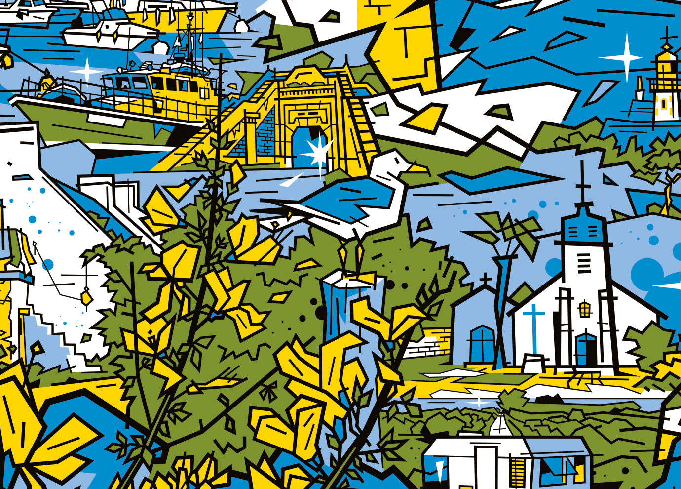 Version épurée de l’illustration Belle-Île-en-Mer , initialement pensée pour la réalisation d'une fresque murale (Plus d'infos dans "Carnet de Bord), cette interprétation Low Colors se concentre sur la construction graphique et la cohérence des formes. Réduite à quatre teintes essentielles, la composition gagne en force visuelle et en lisibilité, rappelant l’esprit des impressions sérigraphiques.