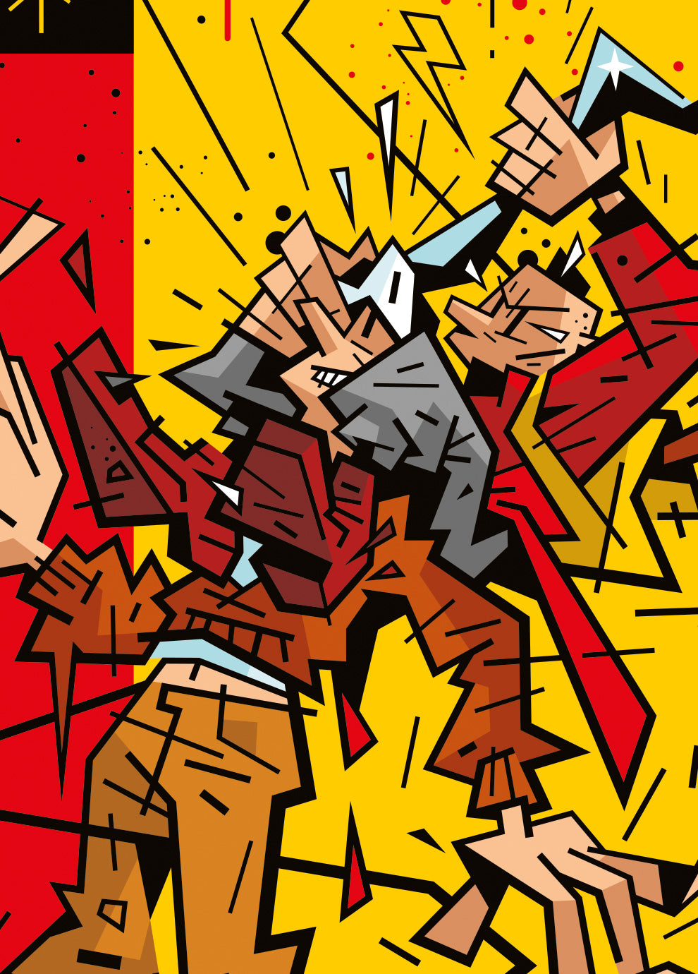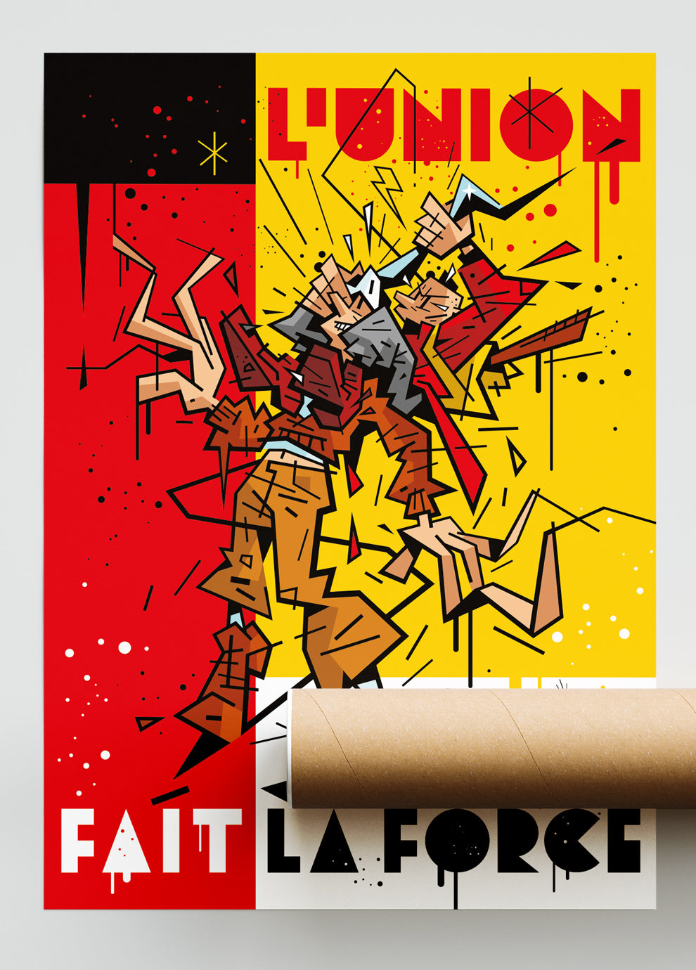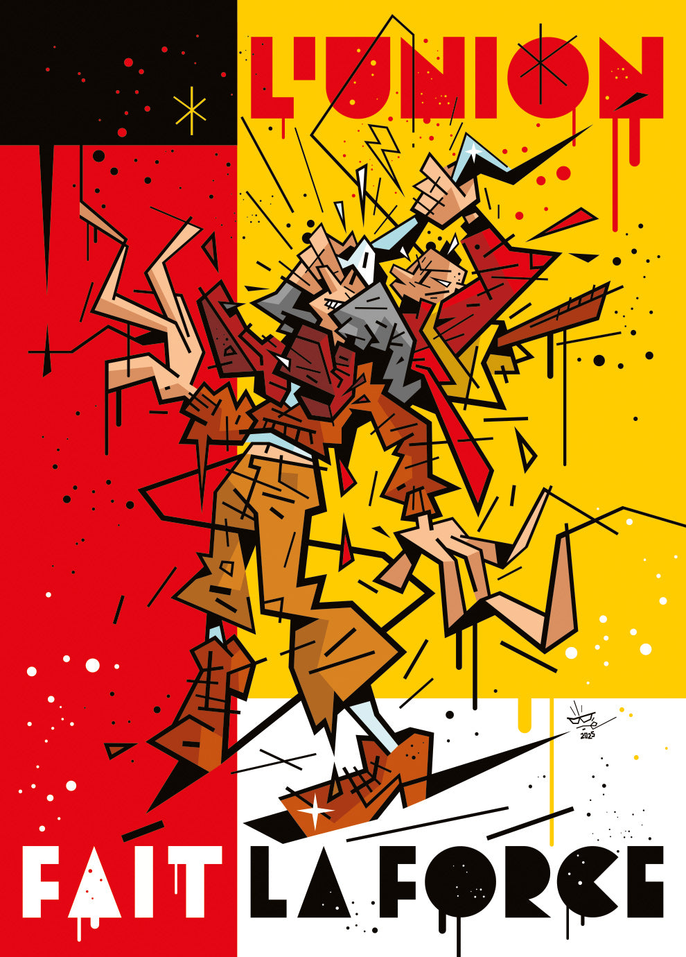 Dans cette scène hommage, Le Jeune Albert, l’insolent et espiègle garnement d’Yves Chaland, se hisse sur les épaules de Jopo de Pojo, figure culte de Joost Swarte, pour tenter de dévoiler le mystère que cache son célèbre aileron. Cette confrontation burlesque célèbre la rencontre de deux icônes de la ligne claire franco-néerlandaise des années 80, revisitant leurs univers avec humour et complicité graphique. Le fond aux couleurs noir, jaune et rouge évoque ouvertement l’école belge, berceau et carrefour de cette esthétique, tandis que le titre "L’union fait la force", devise nationale, ajoute une dimension malicieusement symbolique à cette réunion improbable.