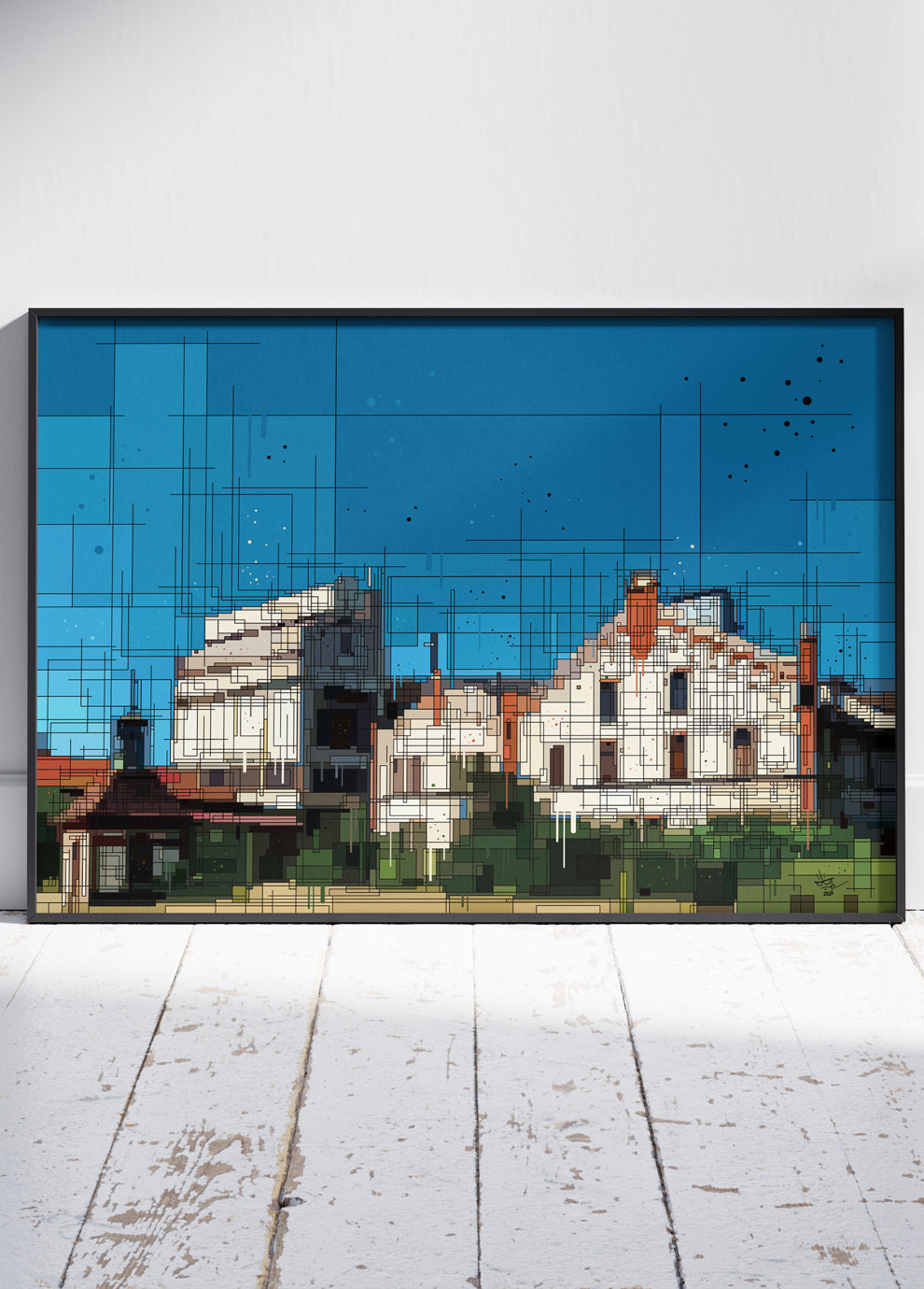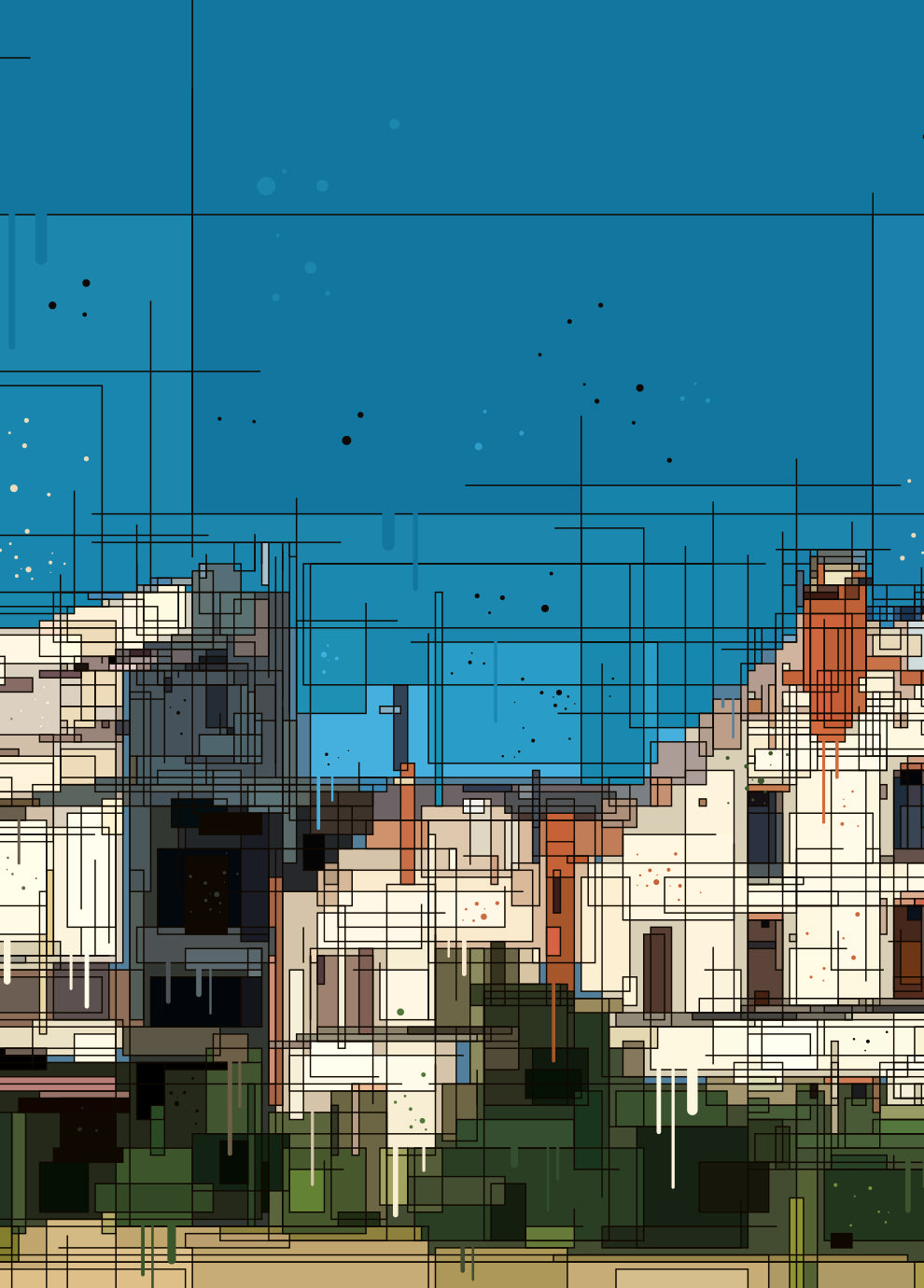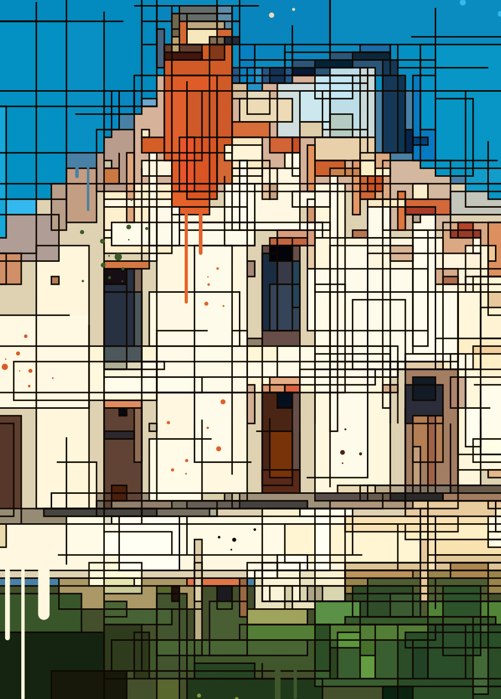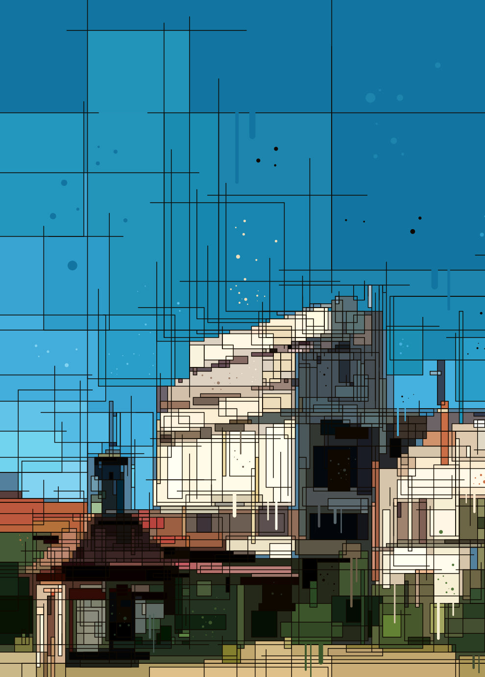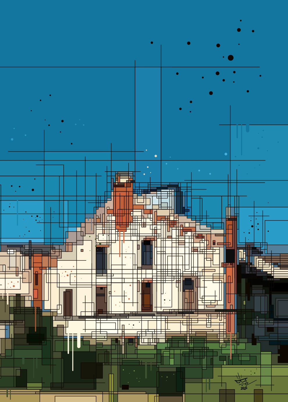 L’image propose une lecture fragmentaire de cette architecture, comme si elle était perçue à travers une mémoire en recomposition. Les lignes se croisent, interrompent les volumes, suggèrent plus qu’elles ne décrivent. Les bâtiments apparaissent par fragments, oscillant entre présence et effacement. L’ensemble évoque moins un état précis qu’un souvenir en construction, où le regard reconstitue progressivement ce qui fut un lieu de production, devenu aujourd’hui espace de transition.