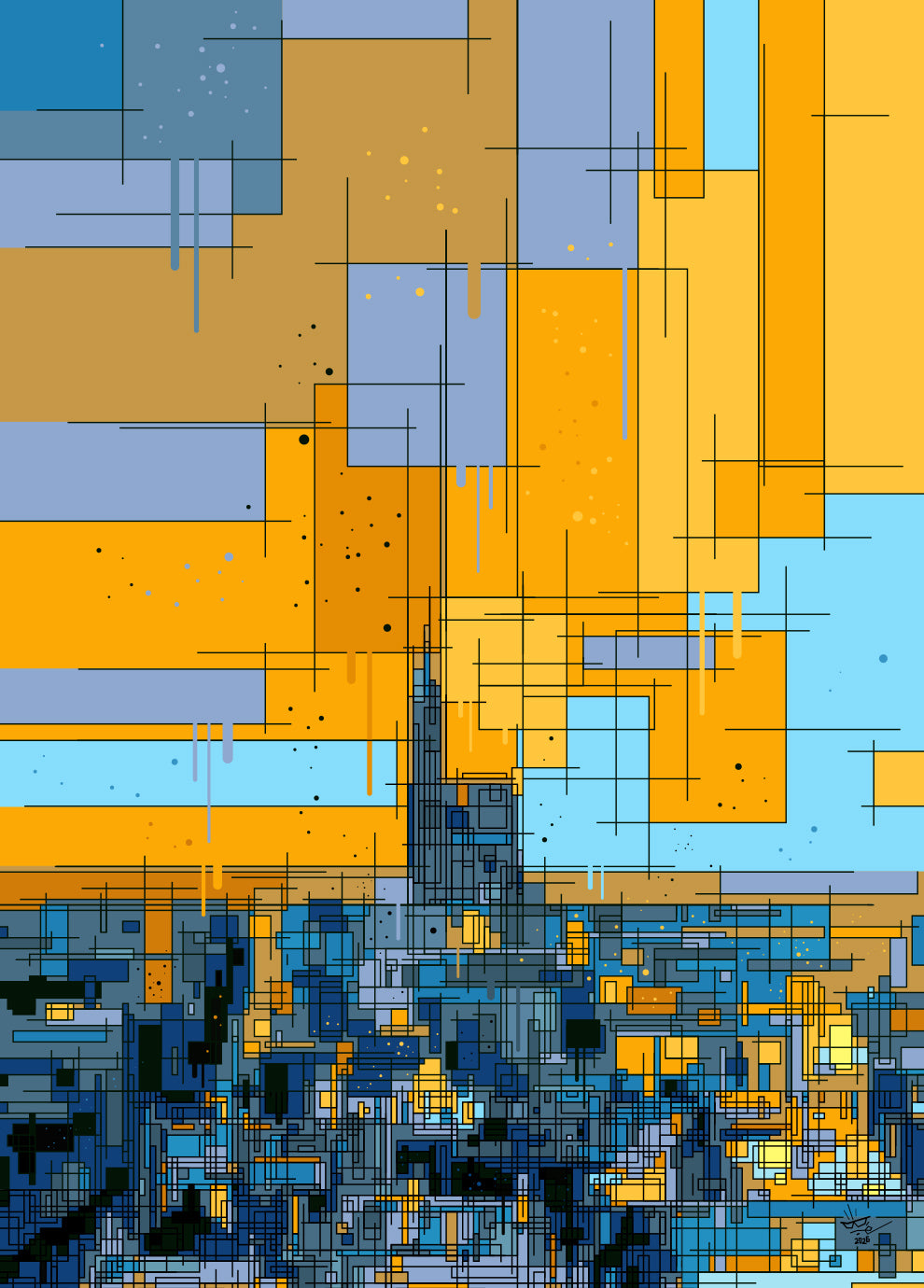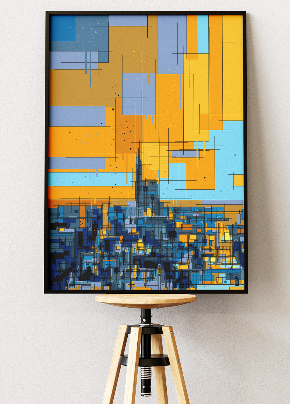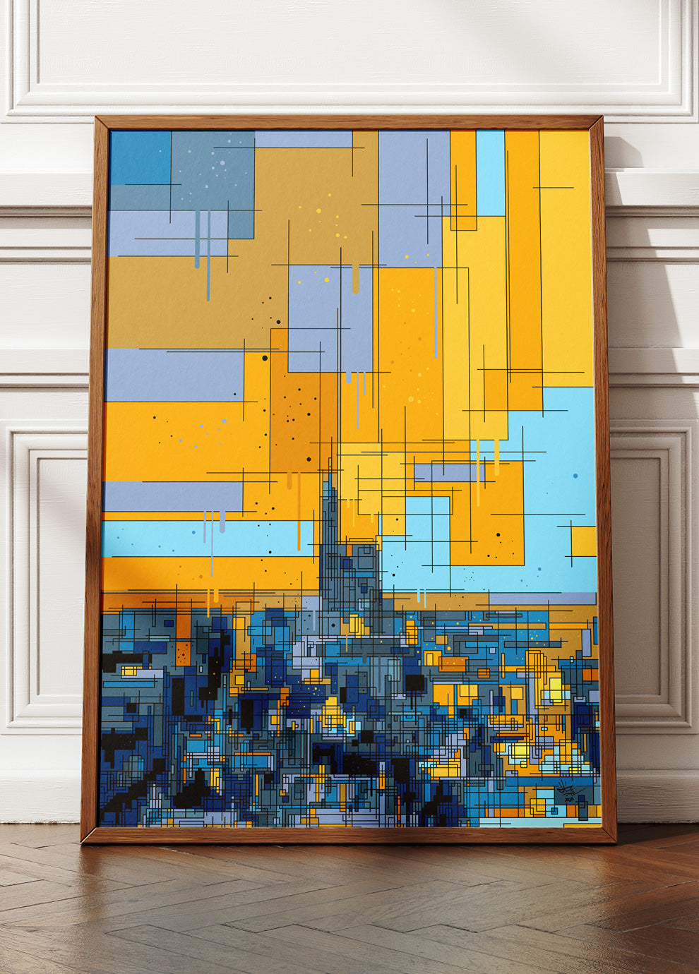 Construite à partir d’un réseau de lignes verticales et horizontales, l’image se révèle progressivement dans un jeu de structures qui fragmentent et recomposent l’espace. Les teintes du coucher de soleil enveloppent la scène d’une lumière chaude, contrastant avec la rigueur géométrique de la composition. À distance, la ville se dessine clairement, tandis qu’à proximité, elle se décompose en un maillage graphique, entre abstraction et évocation architecturale.